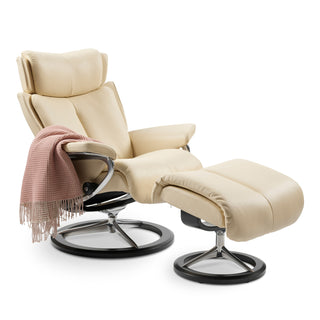 Yes, we dare say it: Stressless Magic is the most comfortable chair Stressless has ever made. What makes this recliner so special is the shape of the seat and back, which envelopes you and gives your body support in all of the right places. Add to that its comfort zones and a thick pillow made from foam and fibers, and you have a recliner which provides the ultimate in relaxation. Don’t just take our word for it: visit Stressless retailers and feel the Magic!