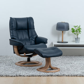 The Nordic Recliner range offers classic Norwegian design, laminated wood, and steel frames for stability. Find your perfect fit among two sizes. Benefit from the adjustable headrest, Comfort Glide™ system for easy reclining, and 360° swivel mechanism. The freestanding footstool complements your leg length. Cold-Cure Foam Cushioning provides lasting comfort and durability. Customize your recliner with leather, fabric, and wood finishes, adhering to Norwegian quality standards.
