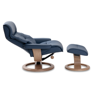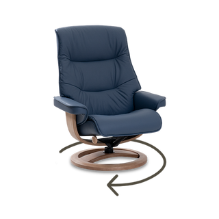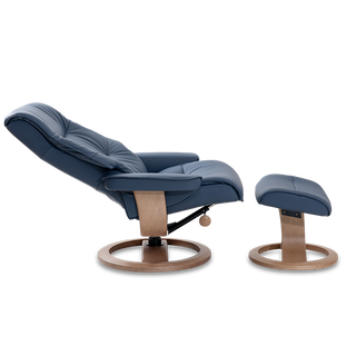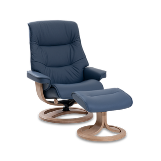 The Nordic Recliner range offers classic Norwegian design, laminated wood, and steel frames for stability. Find your perfect fit among two sizes. Benefit from the adjustable headrest, Comfort Glide™ system for easy reclining, and 360° swivel mechanism. The freestanding footstool complements your leg length. Cold-Cure Foam Cushioning provides lasting comfort and durability. Customize your recliner with leather, fabric, and wood finishes, adhering to Norwegian quality standards.